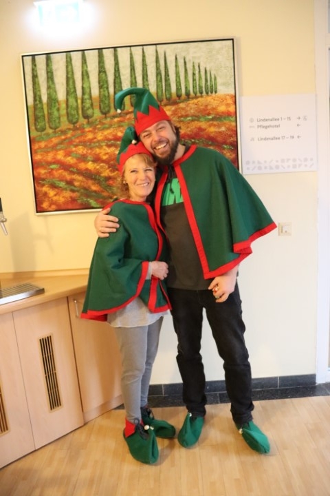 Am Nikolaustag waren wieder zwei witzige Wichtel des Begleitenden Dienstes im Haus mit kleinen Schokoladengrüßen unterwegs und hatten selber viel Freude an ihrem Tun. Geradezu gerührt waren sie darüber, dass eine Bewohnerin sich daraufhin zu Fuß auf den Weg in die Stadt machte, um ihnen zum Dank ein Mettbrötchen und eine Bockwurst zu holen.