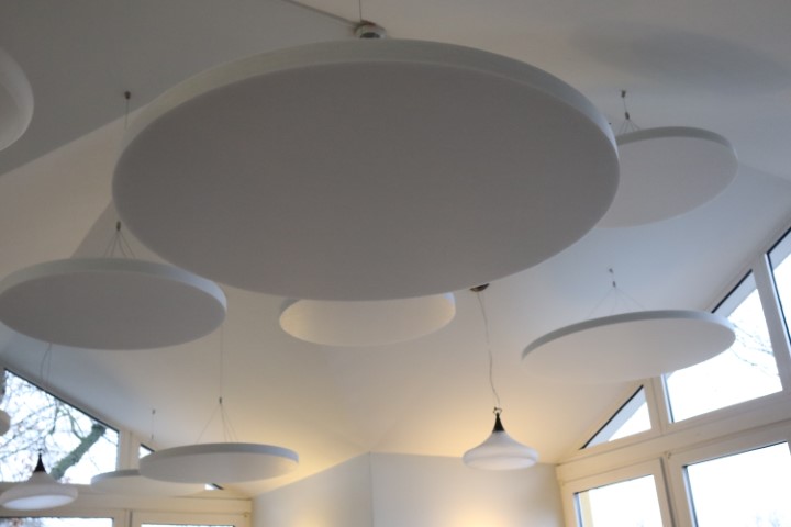 Nach den fliegenden Kaffeekannen aus dem vorletzten Wochenbericht nun also die dazu passenden fliegenden Untertassen? Sieht ganz so aus und hat doch eine wesentlich unspektakulärere Erklärung. Unser Café Deinerlinde hatte bislang ein allseits störendes akustisches Problem. Es haaalllte fürchterlich. Jetzt aber hallt es nicht mehr und dies verdanken wir den Schall schluckenden runden Deckenelementen, die auf obigem Bild zu sehen sind.