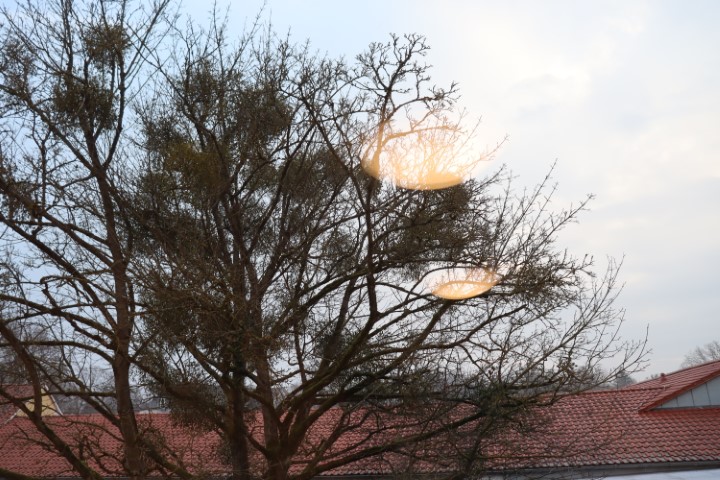 Eher nicht, sondern die Reflexion der Lampen im Fenster der Wohnküche der Brombeergasse, von wo diese Aufnahme der Misteln entstand, die sich im Ahorn an der Kräuterschnecke massiv ausgebreitet haben.