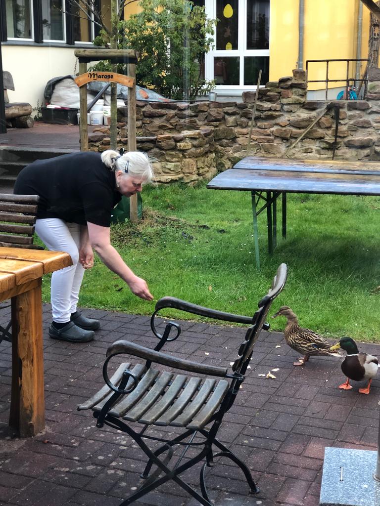 Vor einigen Jahren hat eine Ente sogar direkt an der Hauswand neben dem Hauseingang gebrütet und acht Küken schlüpften dort schließlich. Als wir dann einen Namen für die  brütende Ente suchten, lautete der Vorschlag von Küchenleitung Claudia Thüne allerdings tatsächlich „Süß-Sauer“.