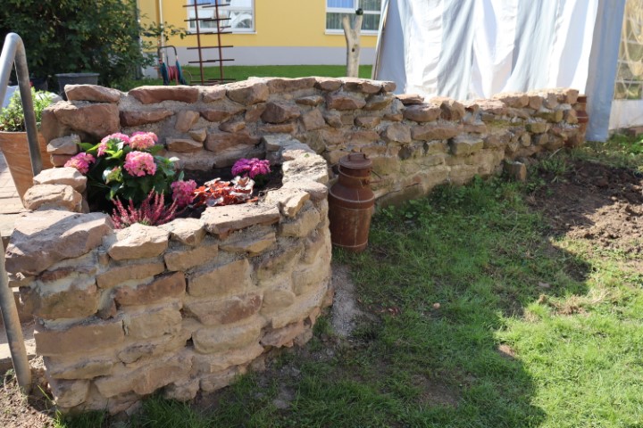 Im Maronenhof tut sich ja immer etwas! In diesen Tagen ist er „blumiger“ geworden. Im Rondell an der Natursteinmauer, die im Begriff ist nun fertig zu werden, sind erste Blumen gepflanzt und auch das Tragegestell, das ursprünglich zum Aufmauern des Backofens diente, fand nun eine neue Verwendung als Blumenkübel.