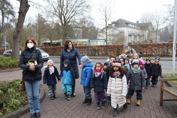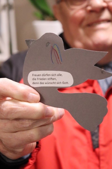 Besuch der „Raupengruppe“ aus der Evangelischen Kindertagesstätte „Pusteblume“. Frieden war das Thema, das sie behandelt haben und so haben sie Friedenstauben gebastelt, die sie für die Deinerlinde dem Vorsitzenden des Heimbeirates, Friedel Reese, überreichten, der diese anschließend in die Briefkästen verteilte.
