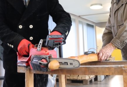 Als Nachtisch gibt es Dresdner Stollen. Und obwohl schon in vielen Küchen die vollelektrische Stichsäge Einzug gehalten hat, benutzen wir noch die traditionelle Bügelsäge zum Zerteilen.
