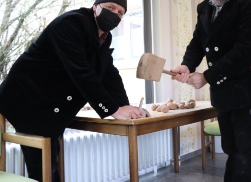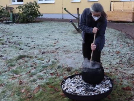 Da das Backhaus noch nicht in Betrieb ist, mussten die Baulöwen sich anders behelfen, um an ihr Mittagessen zu kommen. Anderthalb Jahre nun schon essen sie mittwochs miteinander. Meistens Eintopf, denn am Mittwoch gibt es diesen, als eines von zwei Menüs. Zum Abschluss des Baujahres wollten sie diesen nun aber mal selber kochen.