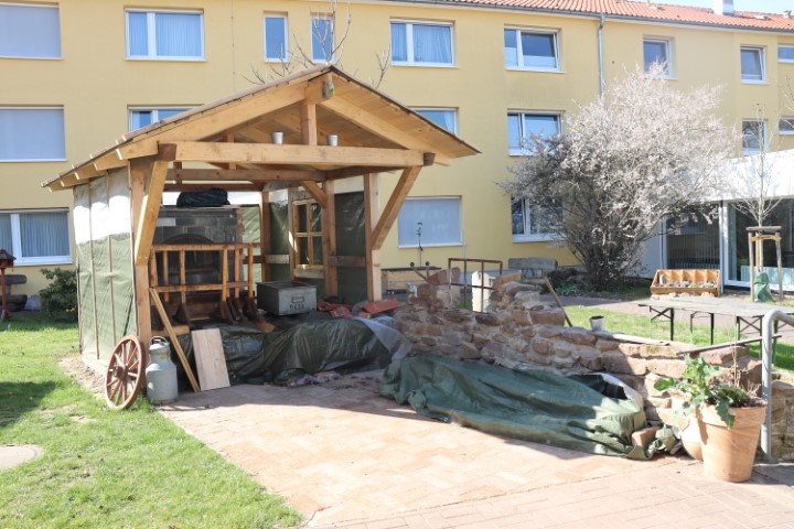 Zum ersten mal nach der Winterpause trafen sich die Baulöwen und freuten sich zunächst mal, dass das noch unfertige Backhaus gut durch Sturm, Regen und Kälte gekommen ist.