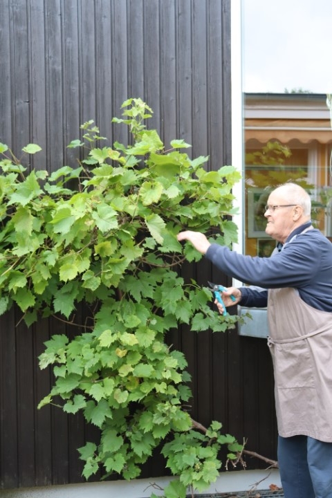 Dem Weinstock in der Deinerlinde erging es in diesem Jahr nicht besser als vielen Weinstöcken in den Weinanbaugebieten. Die feuchte Witterung hatte einen Befall mit falschem Mehltau zur Folge, so dass Friedel Reese zunächst mal die befallen Beeren abschnitt und den Weinstock kürzte.