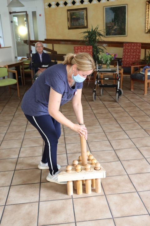 Dem Schwiegervater von Andrea Heikens haben wir die neue „Kegel-Abstandshalter-Schablone“ zu verdanken. Mit ihr sollen künftig ungleiche Wettbewerbsbedingungen beim Kegeln vermieden werden, da nun bei allen Mitkeglern die Kegel im selben Abstand zueinander stehen.