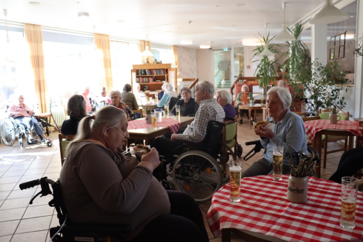 Gut besucht war das Marktwagenfest immer, aber so gut wie in diesem Jahr wohl doch noch nie. An die 70 Personen, eingeschlossen die Gäste der Tagespflege, kamen im Laufe des Vormittages am Marktwagen vorbei. Nicht nur um ein Hot-Dog zu essen, ein Bier zu trinken oder der Musik zu lauschen, sondern auch um munter mit anderen Bewohnern und Bewohnerinnen im Gespräch zu kommen. Man merkt: Nach der zweijährigen Corona-Durststrecke sind wir ausgehungert, was gemeinsame Veranstaltungen angeht.