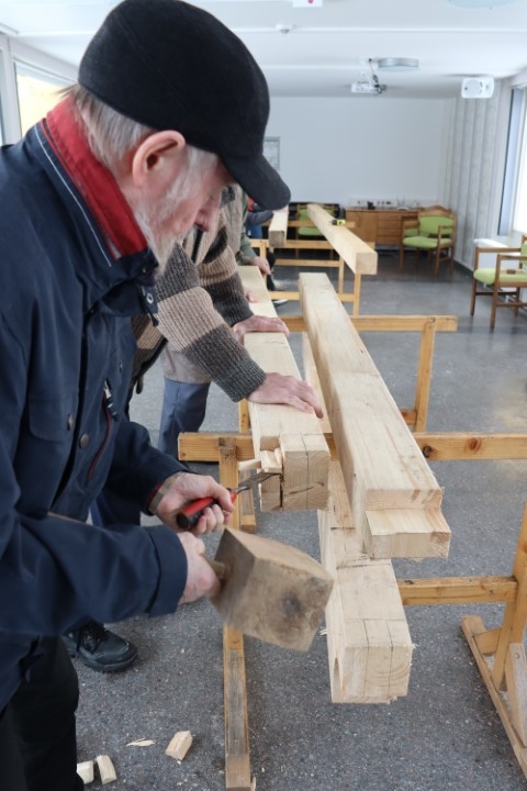 Der Balken auf dem alles ruht, das wusste ich, nennt sich Schwelle. Der Balken, der zum Dach hin abschließt, ist das Rehm. Leicht zu merken, muss man doch nur an unsere Bewohnerin Frau Rehm denken. Die Senkrechten Balken die Schwelle und Rehm verbinden, sind die Ständer, die waagerechten Verbindungen zwischen ihnen sind die Riegel. An den Enden der Ständer und Riegel werden Zapfen herausgearbeitet. Auf untenstehenden Bild macht das gerade Herr Wille, mal mit dem dünnen Stecheisen, mal mit dem dicken Stemmeisen.