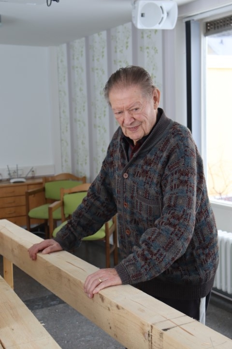 Da ich etwas lernen möchte, lasse ich mir von Tischler Horst Teschke (Bild oben) und Holzgestalter Manfred Kraus-Schelle, während sie arbeiten, etwas über das Handwerk erklären. Schließlich wurden über Jahrhunderte in unseren Städten und Dörfern Häuser so errichtet, wie wir nun auch unser Backhaus bauen. Bis etwa 1880 nahm man dazu Eichenbalken, erst danach benutzte man, so wie auch wir, Fichte.
