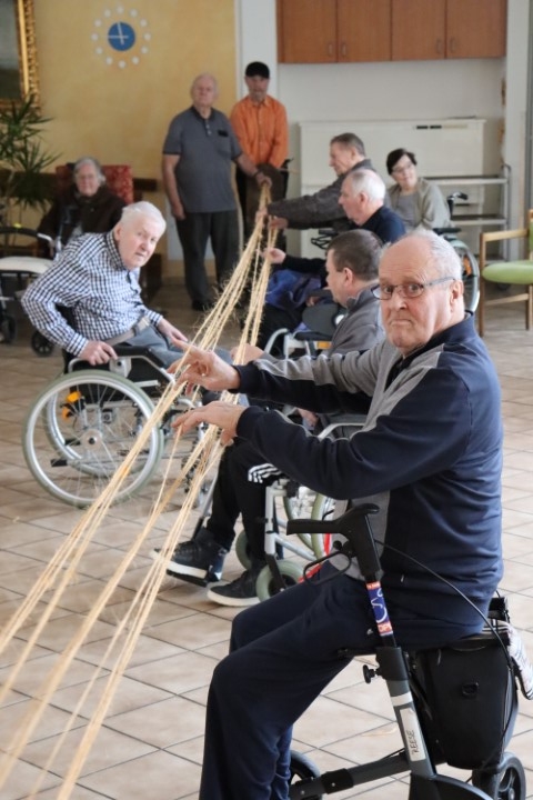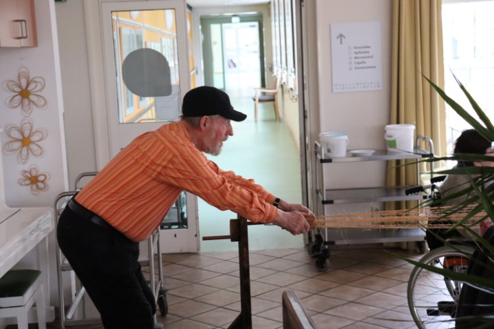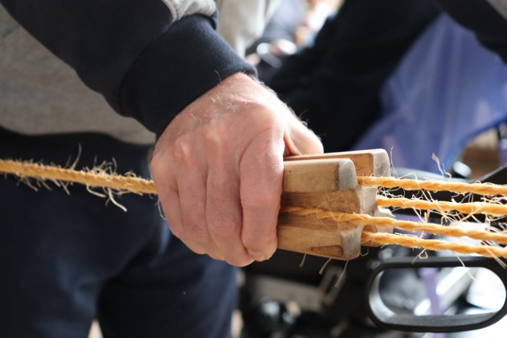 Was also hat es mit der Reeperbahn und den Baulöwen denn nun auf sich? Als „Reep“ wurden Seile und Taue in der Segelschifffahrt bezeichnet. Naheliegend also, dass auch im Hamburger Hafen „Reepschläger“ solche Schiffstaue fertigten. Auf einer „Reeperbahn“ eben, der die gleichnamige Straße in St. Pauli ihren Namen verdankt. Und eine solche Reeperbahn hat Manfred Kraus-Schelle aus seinen Naturwerkstätten in Fredelsloh in das Forum der Deinerlinde geschafft, um mit den Baulöwen ein Tau herzustellen, an dem zu Erntedank im Maronenhof die Erntekrone abgehängt werden soll.